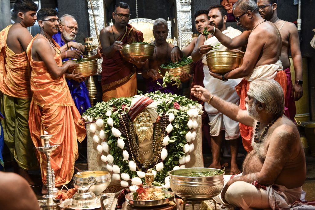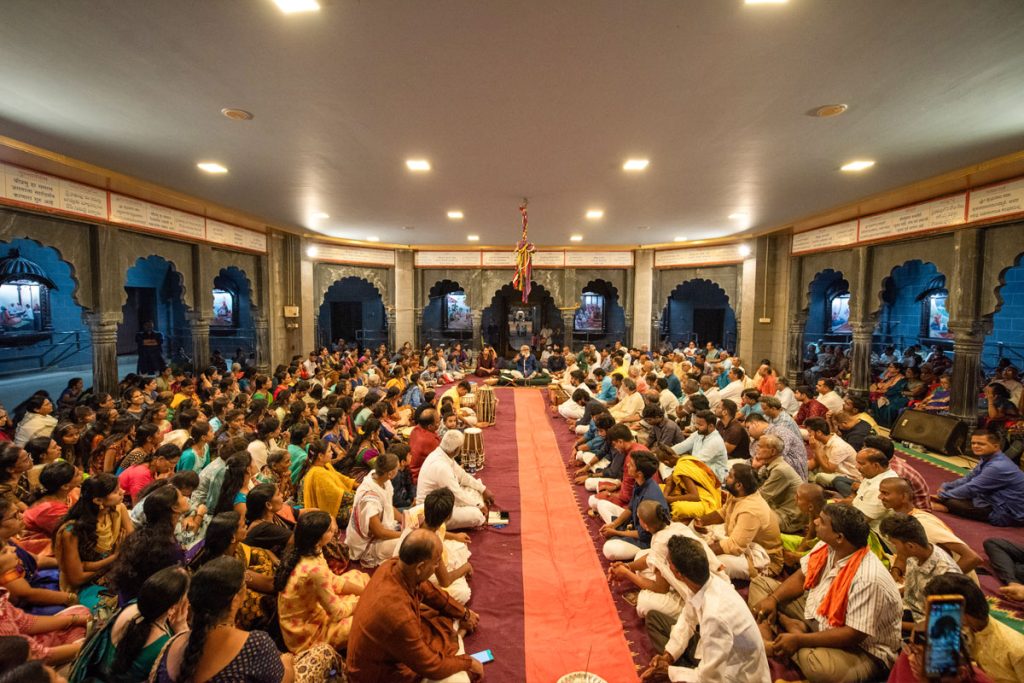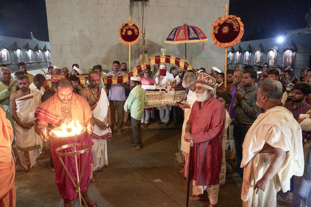The month-long Shravan Maas festival, held between July and August, honors Shri Manik Prabhu Maharaj with daily Mahapooja rituals including Rudrabhishekam, Bilwarchana with 1000 Bilwa leaves, and Sahasranaam chanting. Mondays feature special Bhajans, and evenings include Pradosha Pooja and Vedic chanting. Raksha-Bandhan sees Yagnyopaveetam renewal by students and priests. Mahasankashti honors Lord Ganesh, and Krishna Janmashtami marks Krishna’s birth with midnight Bhajans. On Shravan’s 13th new moon day, Devi Venkamma’s Maha-Samadhi is commemorated. The festival concludes on Bhadrapad’s first day with Anna-Pooja performed by Shreeji.