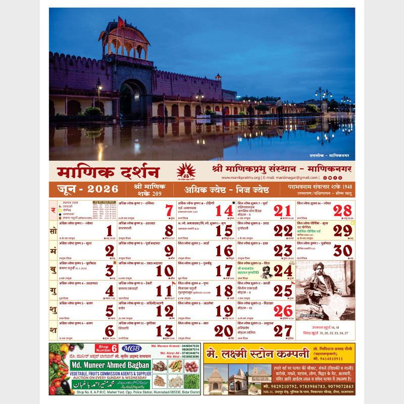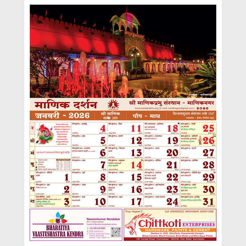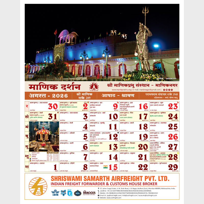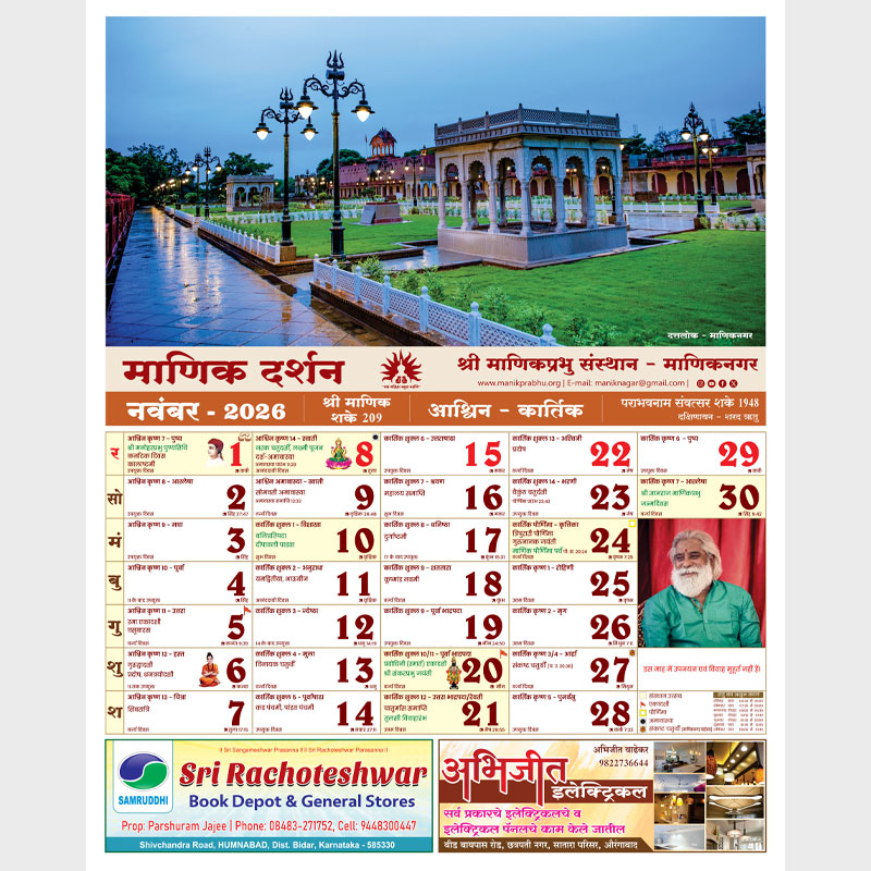 The Manik Darshan Calendar is a thoughtfully designed annual publication of Shri Manik Prabhu Samsthan that beautifully reflects the spiritual rhythm of life at the Samsthan. It highlights all important festivals, utsavas, poojas, and sacred events associated with Shri Manik Prabhu Maharaj and the Maniknagar tradition. More than a date-keeper, this calendar serves as a spiritual guide for devotees, helping them align their daily lives with auspicious occasions and observances throughout the year. Enriched with devotional aesthetics and clarity of information, it brings the grace and presence of Shri Prabhu into homes, workplaces, and places of worship. An essential offering for devotees, the calendar is both practical and devotional, preserving tradition while inspiring remembrance, discipline, and devotion throughout the year.